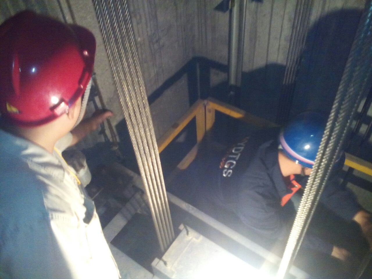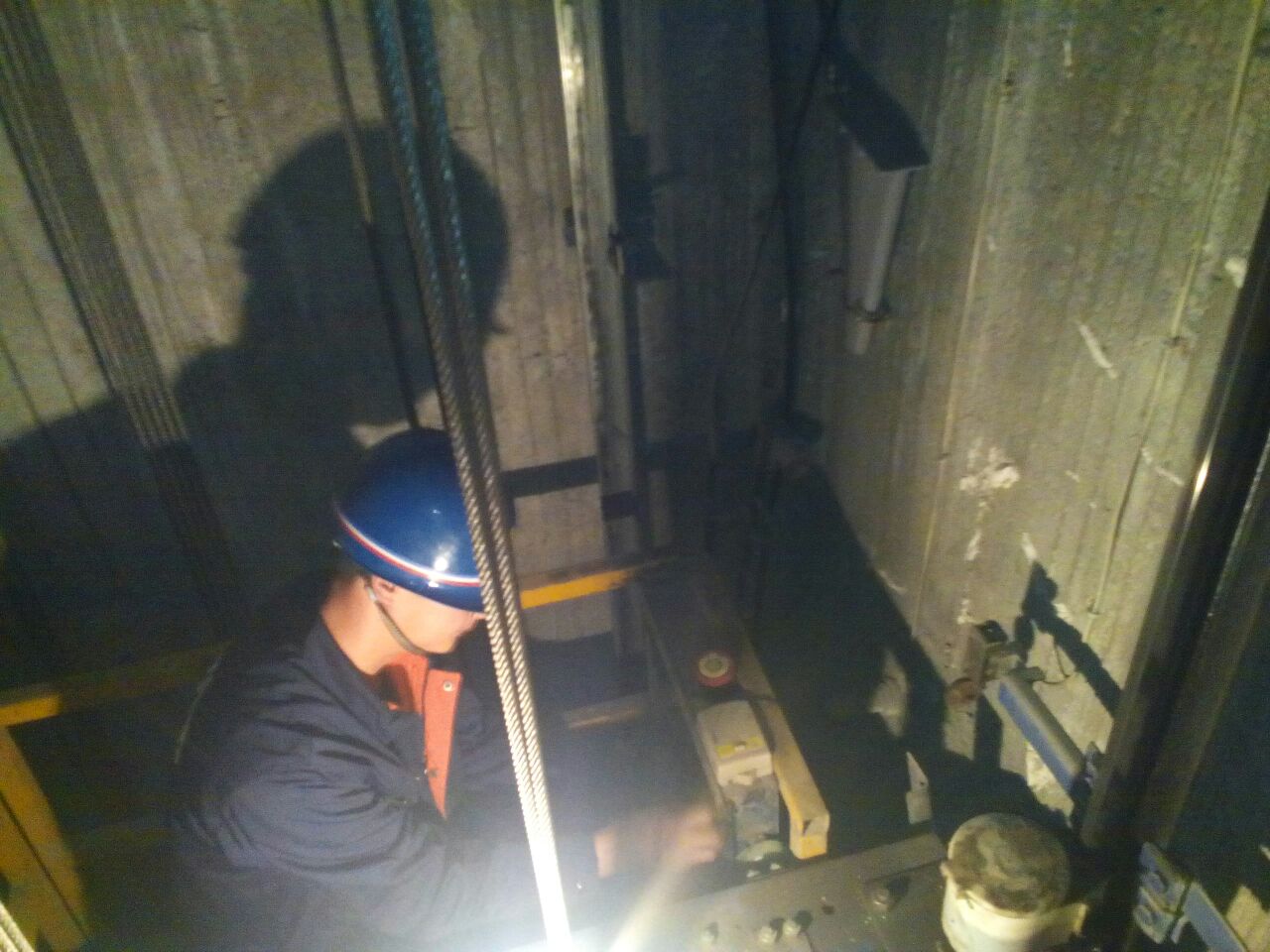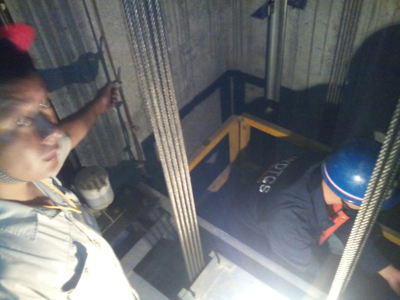 9:45分,檢查人員打開井道門,進(jìn)入轎頂對(duì)開門機(jī)組件、層門裝置、鋼絲繩張力、隨行電纜是否破綻等等進(jìn)行了逐一檢查。