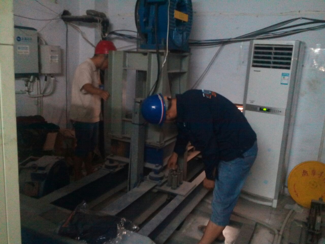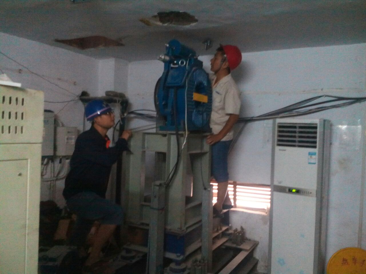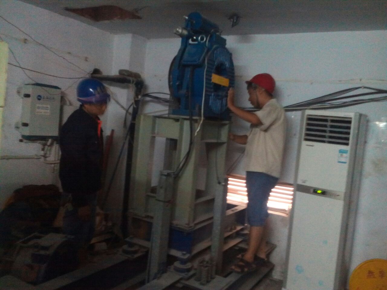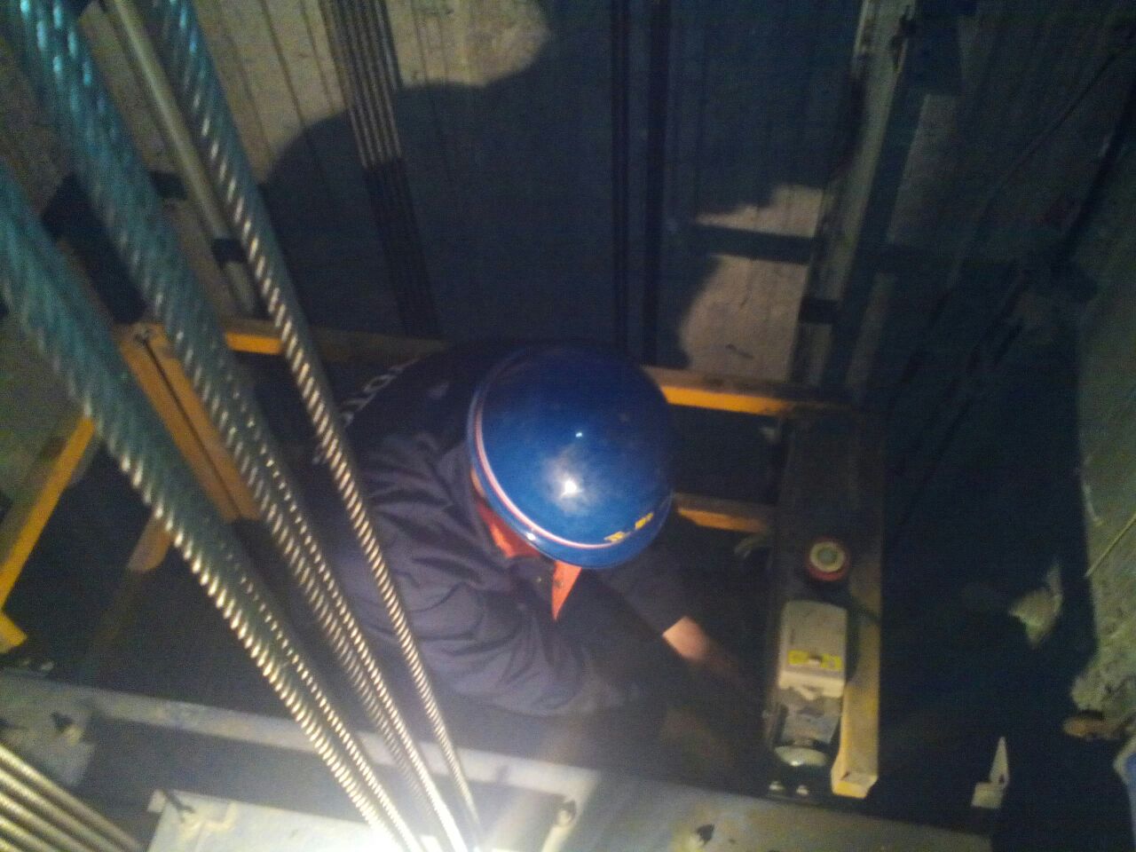 9:45分,檢查人員打開井道門,進(jìn)入轎頂對(duì)開門機(jī)組件、層門裝置、鋼絲繩張力、隨行電纜是否破綻等等進(jìn)行了逐一檢查。